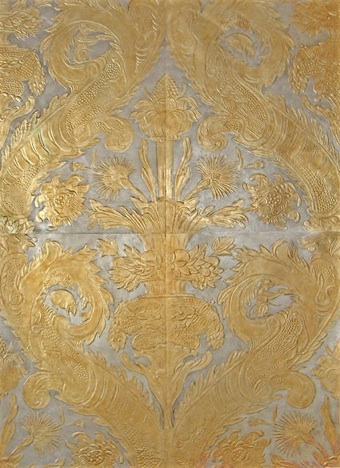 Woodblock-embossed gilded leather panels with tinted varnishes